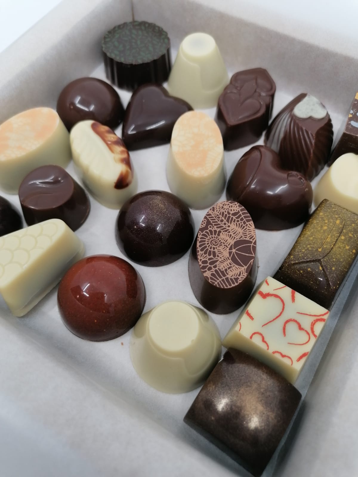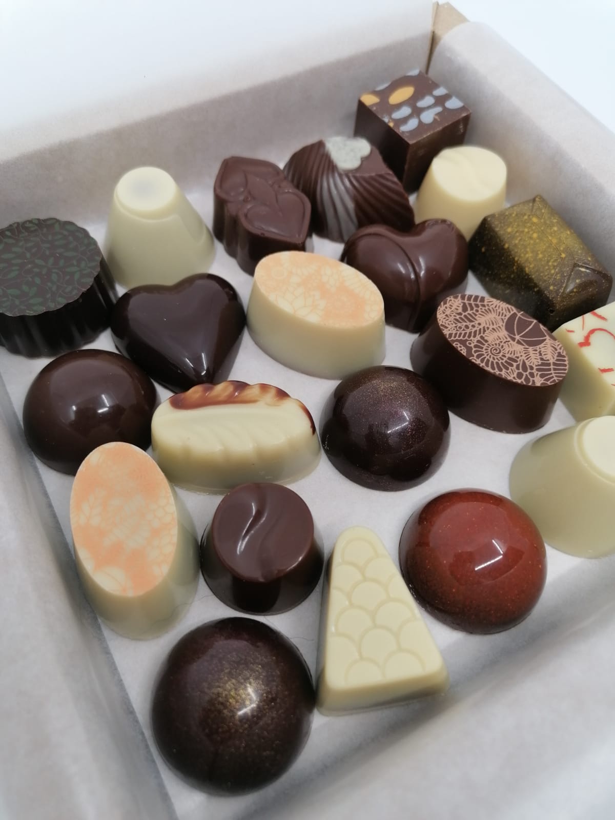 De pralines worden handgemaakt en daarom varieert het uitzicht van de pralines.