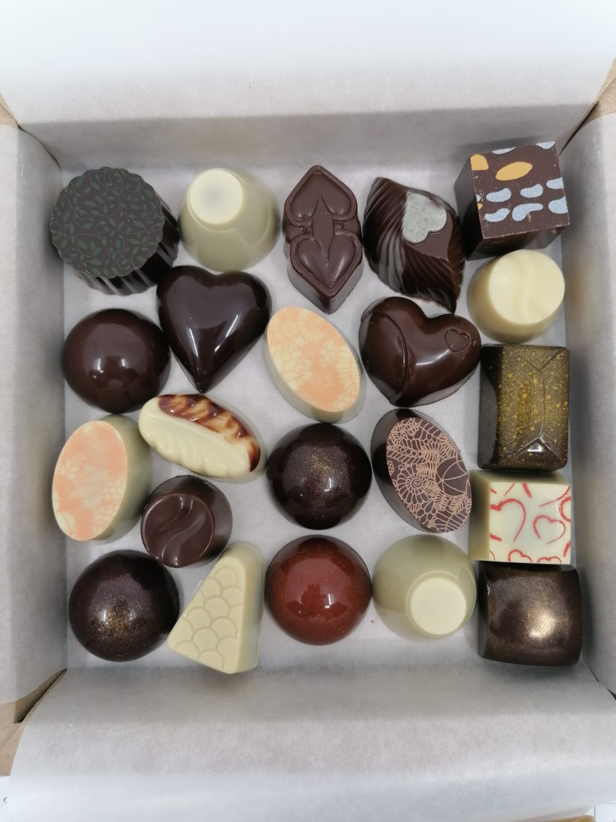 Het doosje bevat een mengeling van pralines, gemaakt in zowel fondant, m!lk bruine cacaofantasie of witte cacaofantasie
