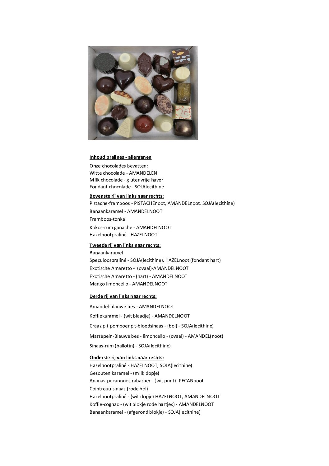 Bij de foto’s kan je zien wat de huidige inhoud van de doosjes exact is – hier staan ook alle allergenen weergegeven per praline.