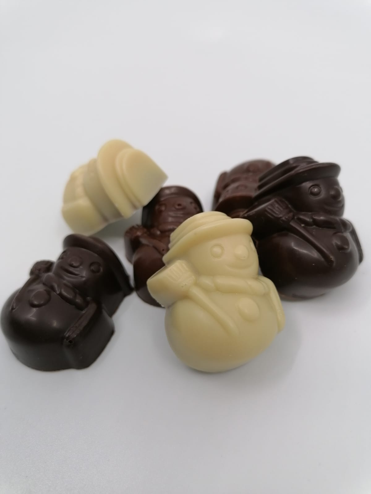 6 sneeuwman pralines in vegan chocolade naar keuze, gevuld met hazelnootpraliné en een krokantje van gekarameliseerde hazelnoot.